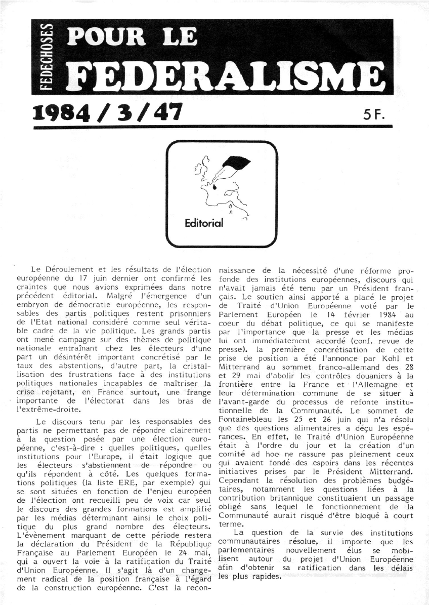 L’événement marquant de cette période restera la déclaration du Président de la République française au Parlement européen le 24 mai, qui a ouvert la voie à la ratification du Traité d’Union européenne. Il s’agit là d’un changement radical de la position française à l’égard de la construction européenne. C’est la reconnaissance de la nécessité d’une réforme profonde des institutions européennes, discours qui n’avait jamais été tenu par un Président français. Le soutien ainsi apporté a placé le projet de Traité d’Union européenne voté par le Parlement européen le 14 février 1984 au cœur du débat politique, ce qui se manifeste par l’importance que la presse et les médias lui ont immédiatement accordée (conf. revue de presse).